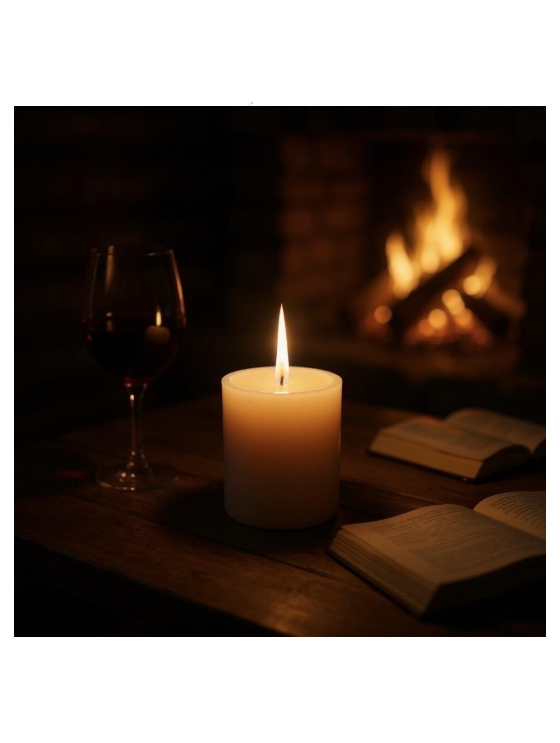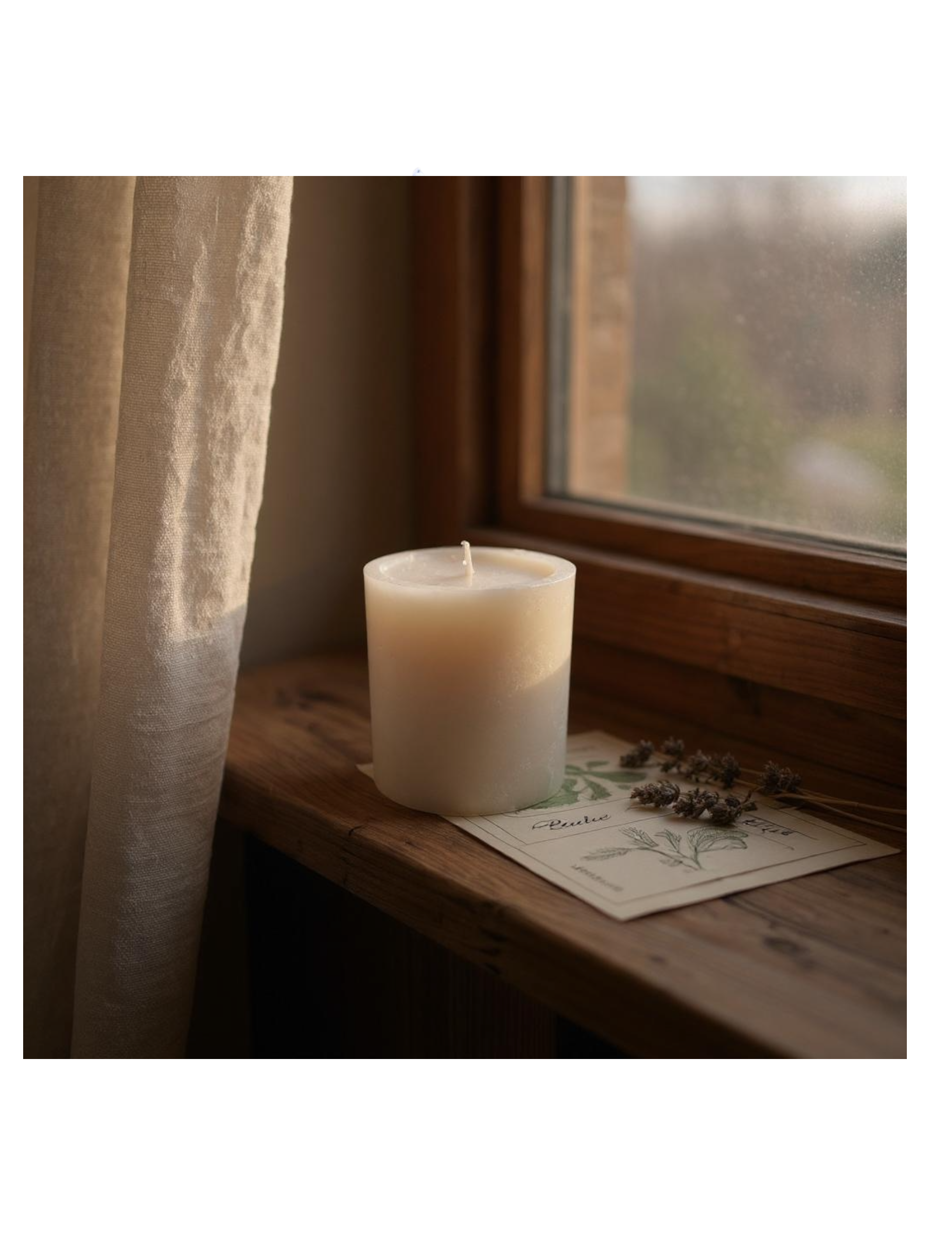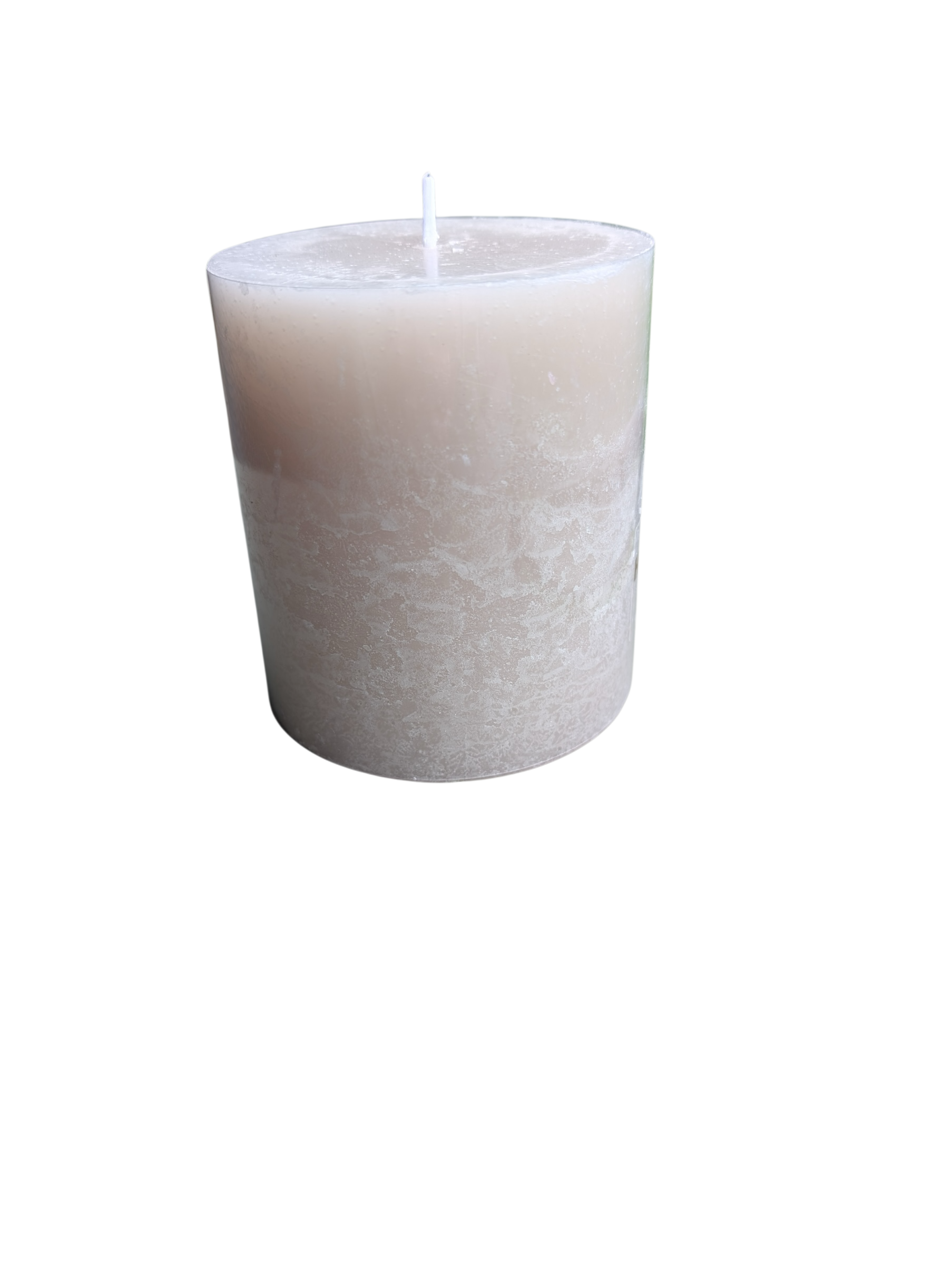 Une bougie pilier de couleur crème, d’environ 10 cm de haut et 9 cm de diamètre. Sa surface présente une texture cireuse et irrégulière, avec des motifs qui ressemblent à des veines ou des marbrures, caractéristiques de la cire de paraffine ou d’un mélange de cires. La mèche, en coton blanc, est centrée au sommet de la bougie.