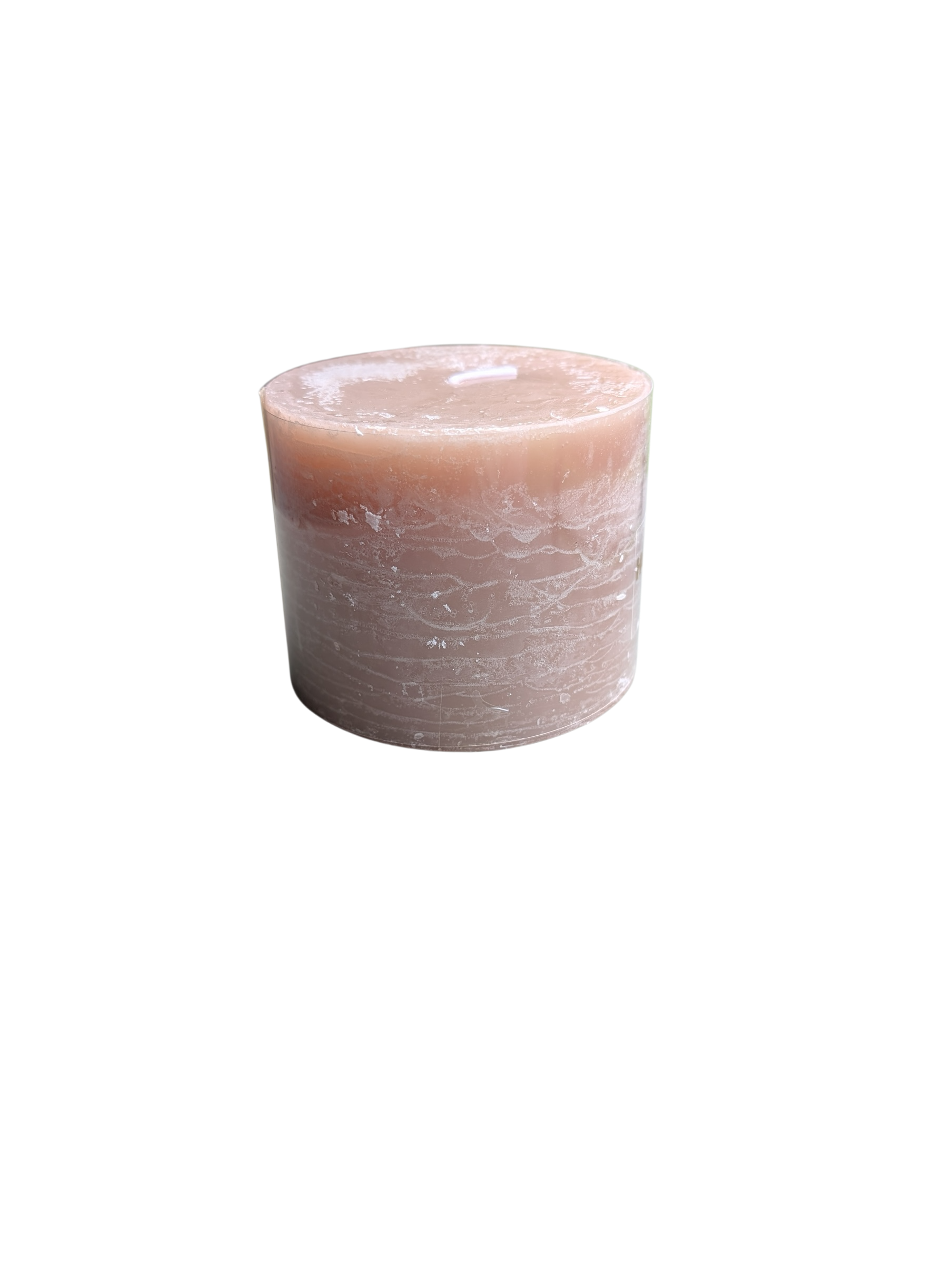 Une bougie pilier de couleur marron, d’environ 7 cm de haut et 9 cm de diamètre. Sa surface présente une texture cireuse et irrégulière, avec des motifs qui ressemblent à des veines ou des marbrures, caractéristiques de la cire de paraffine ou d’un mélange de cires. La mèche, en coton blanc, est centrée au sommet de la bougie.