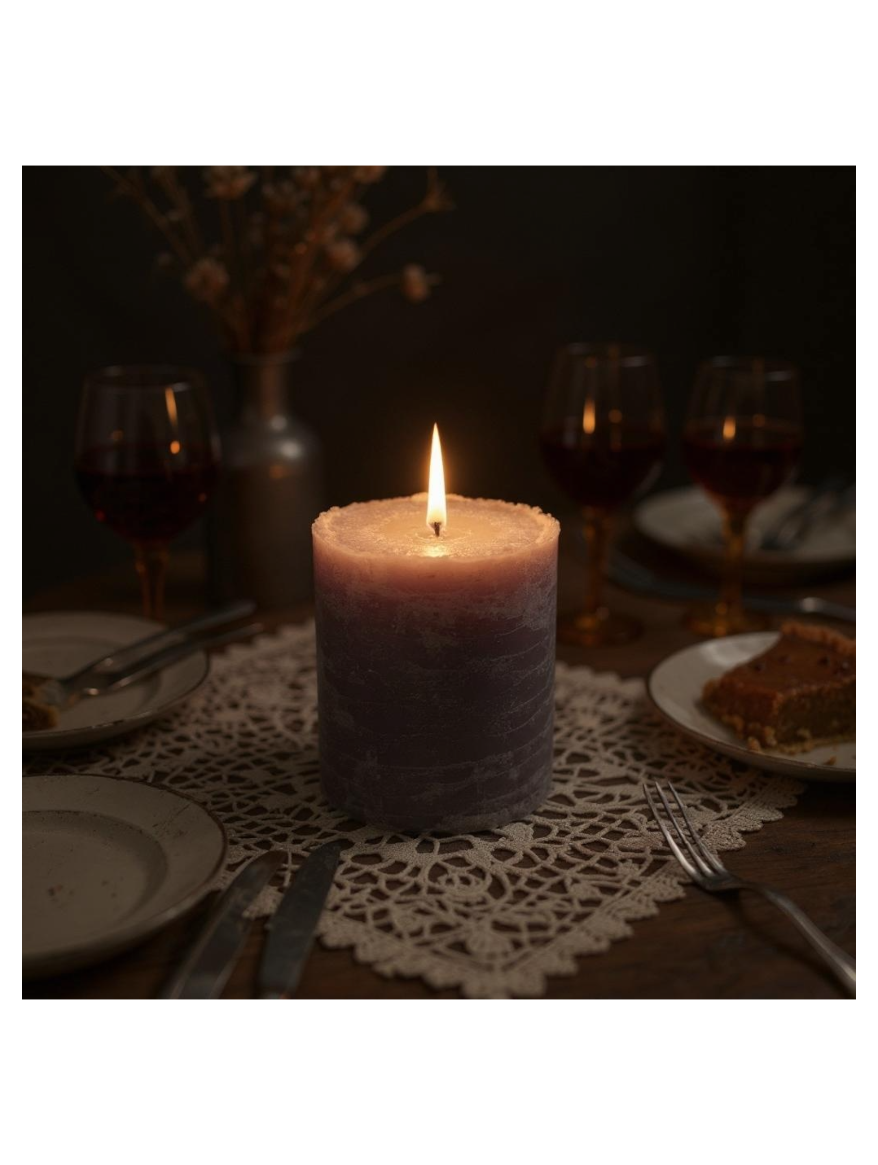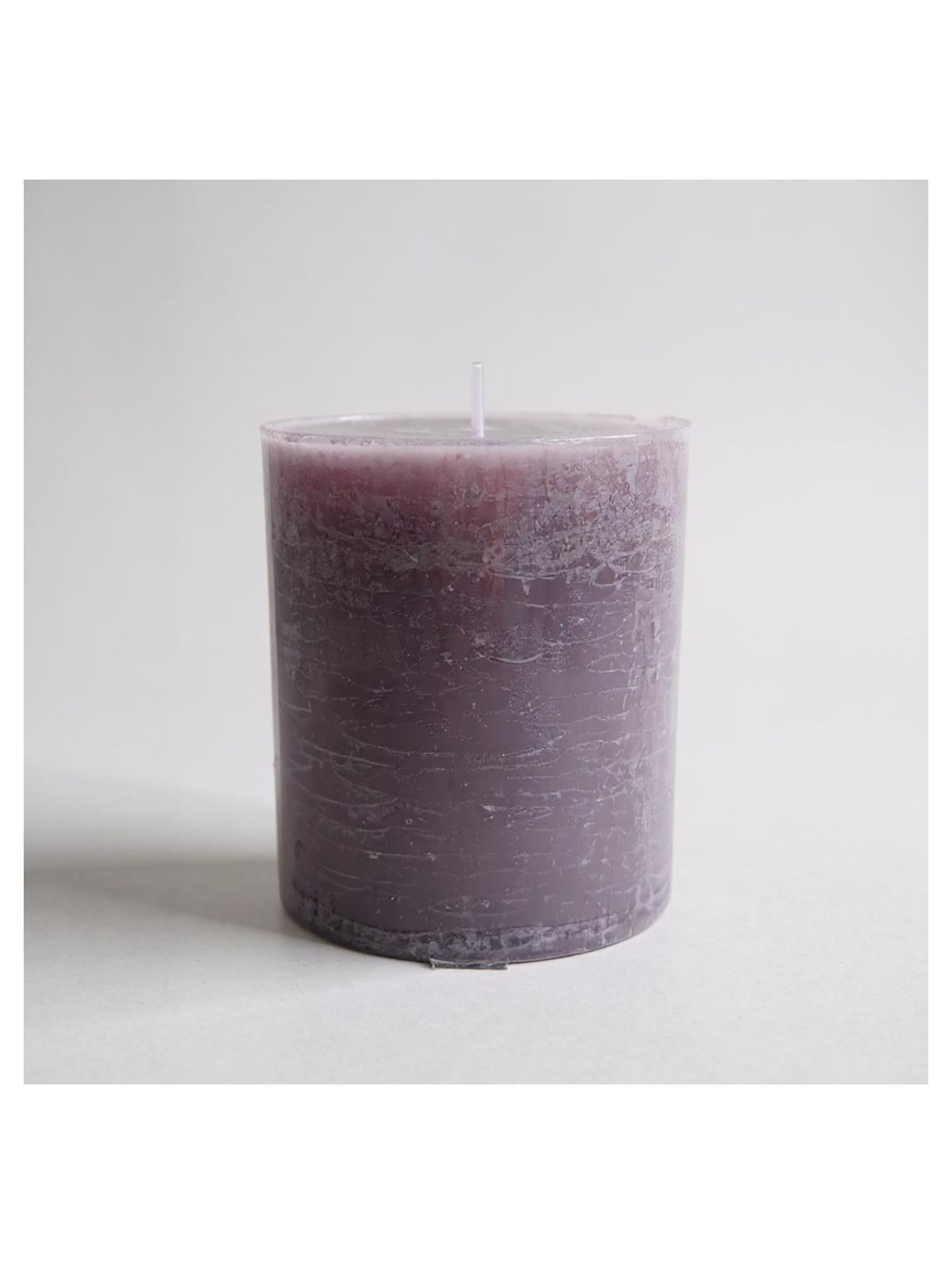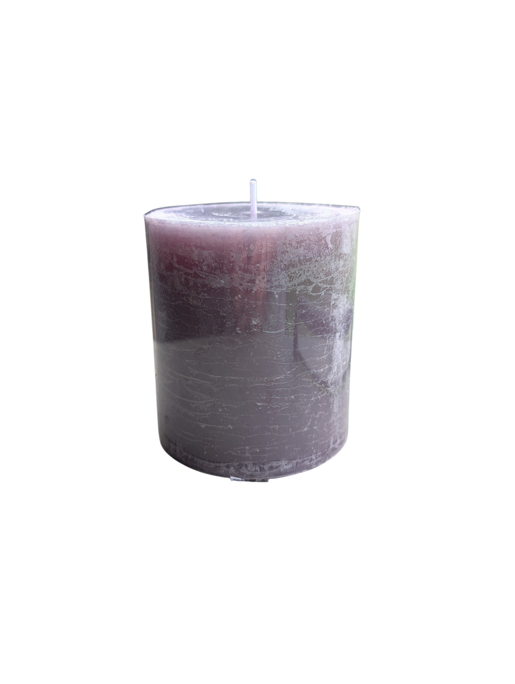 Une bougie pilier de couleur violette, d’environ 10 cm de haut et 9 cm de diamètre. Sa surface présente une texture cireuse et irrégulière, avec des motifs qui ressemblent à des veines ou des marbrures, caractéristiques de la cire de paraffine ou d’un mélange de cires. La mèche, en coton blanc, est centrée au sommet de la bougie.