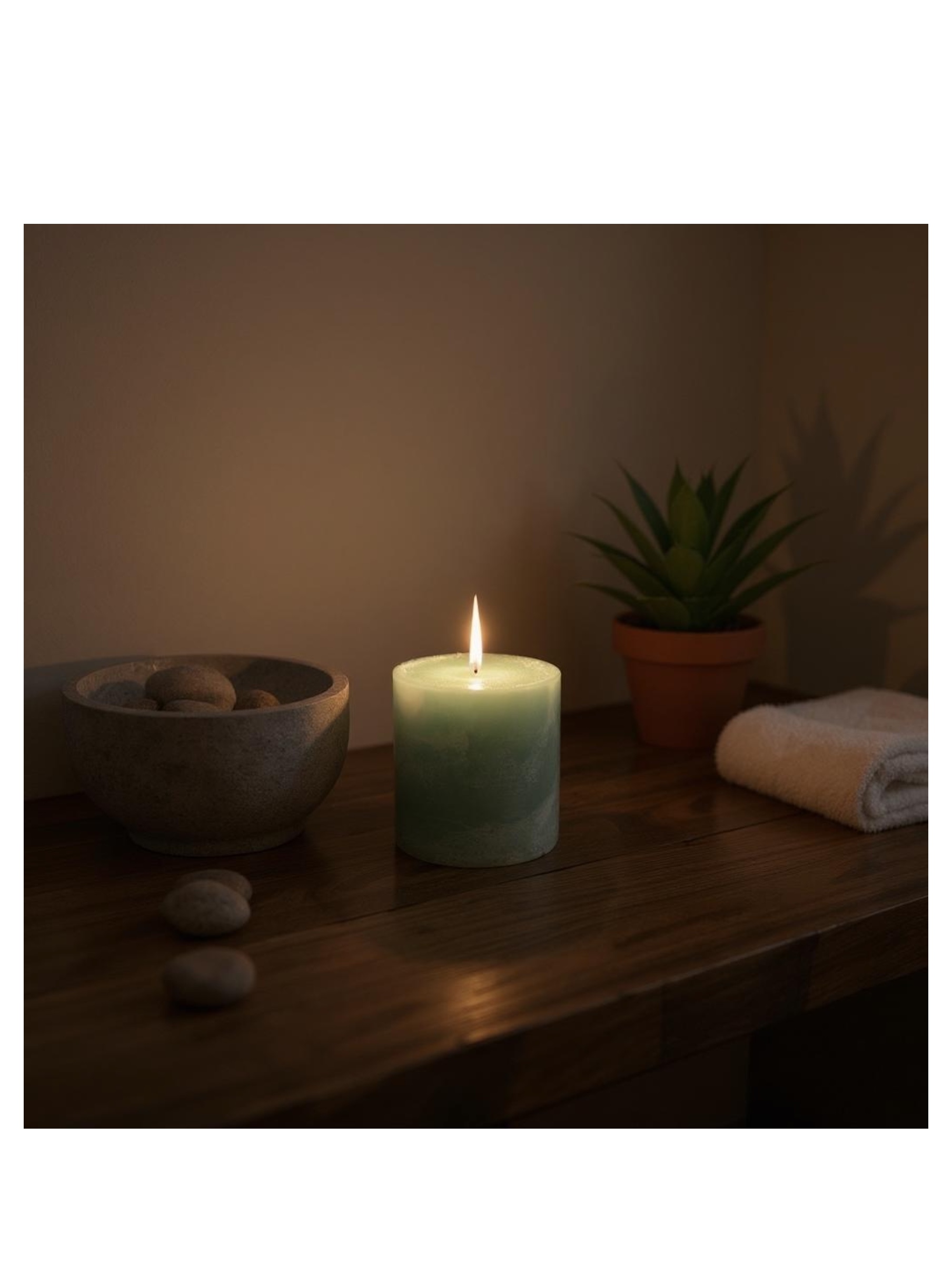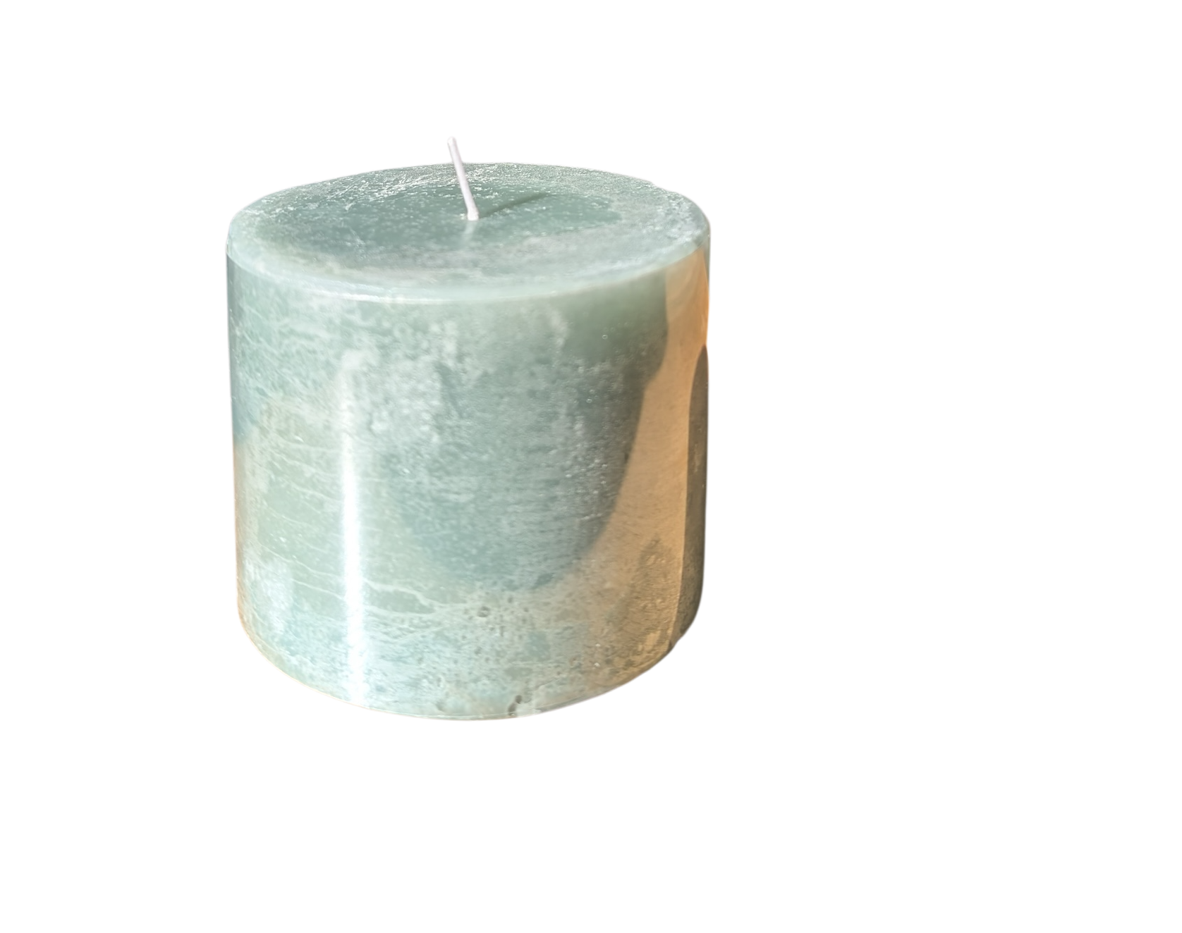Une bougie pilier de couleur verte, d’environ 7 cm de haut et 9 cm de diamètre. Sa surface présente une texture cireuse et irrégulière, avec des motifs qui ressemblent à des veines ou des marbrures, caractéristiques de la cire de paraffine ou d’un mélange de cires. La mèche, en coton blanc, est centrée au sommet de la bougie.