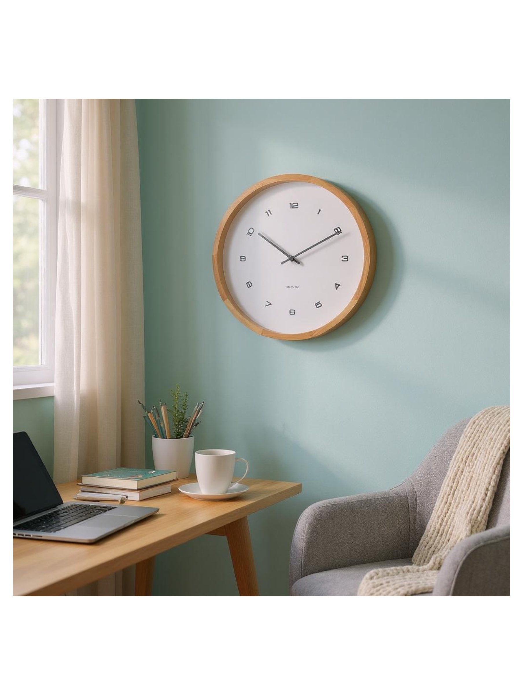 - Design Épuré : Son cadran clair et ses chiffres stylisés, associés à un encadrement en bois clair, offrent une lisibilité parfaite et une esthétique intemporelle.