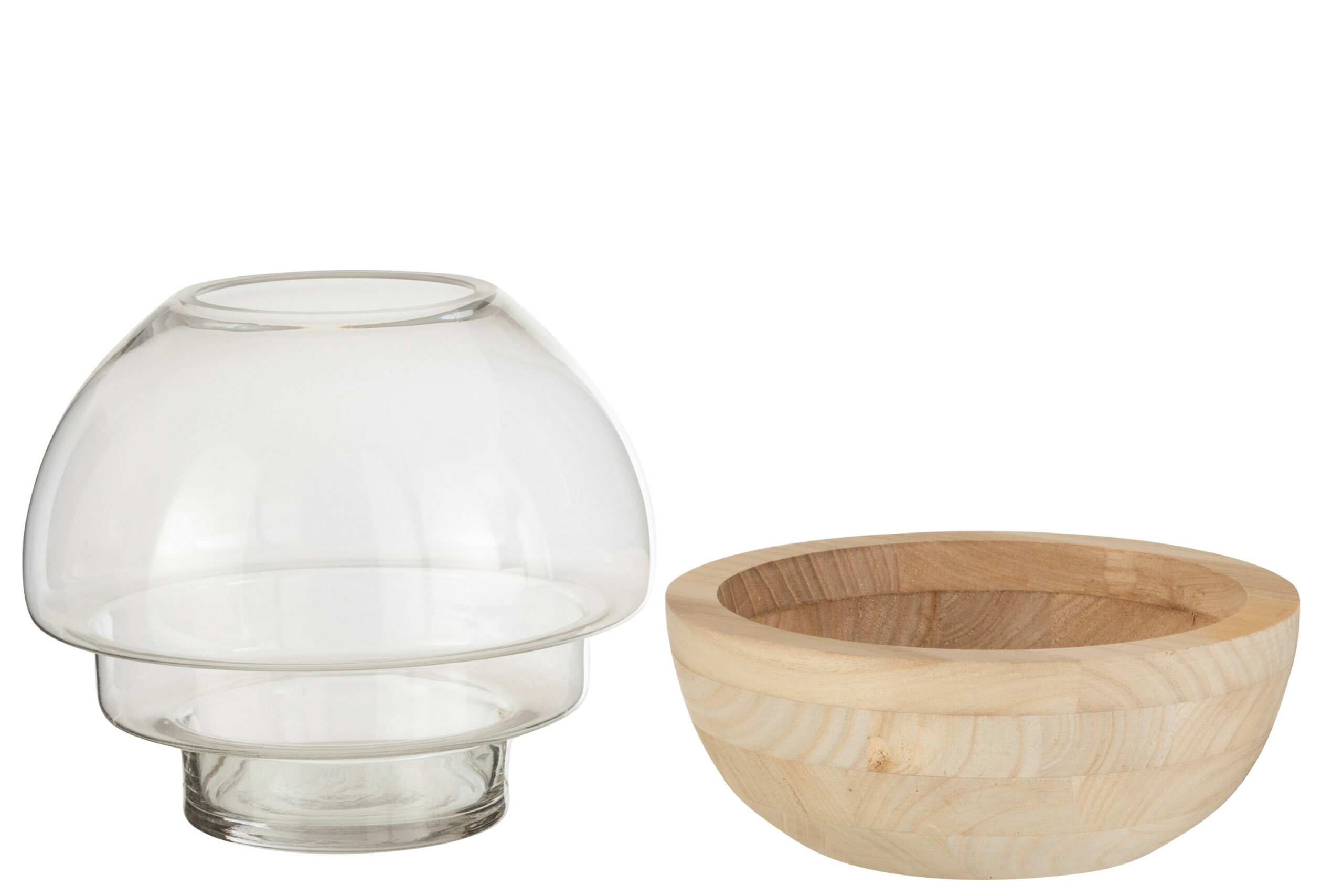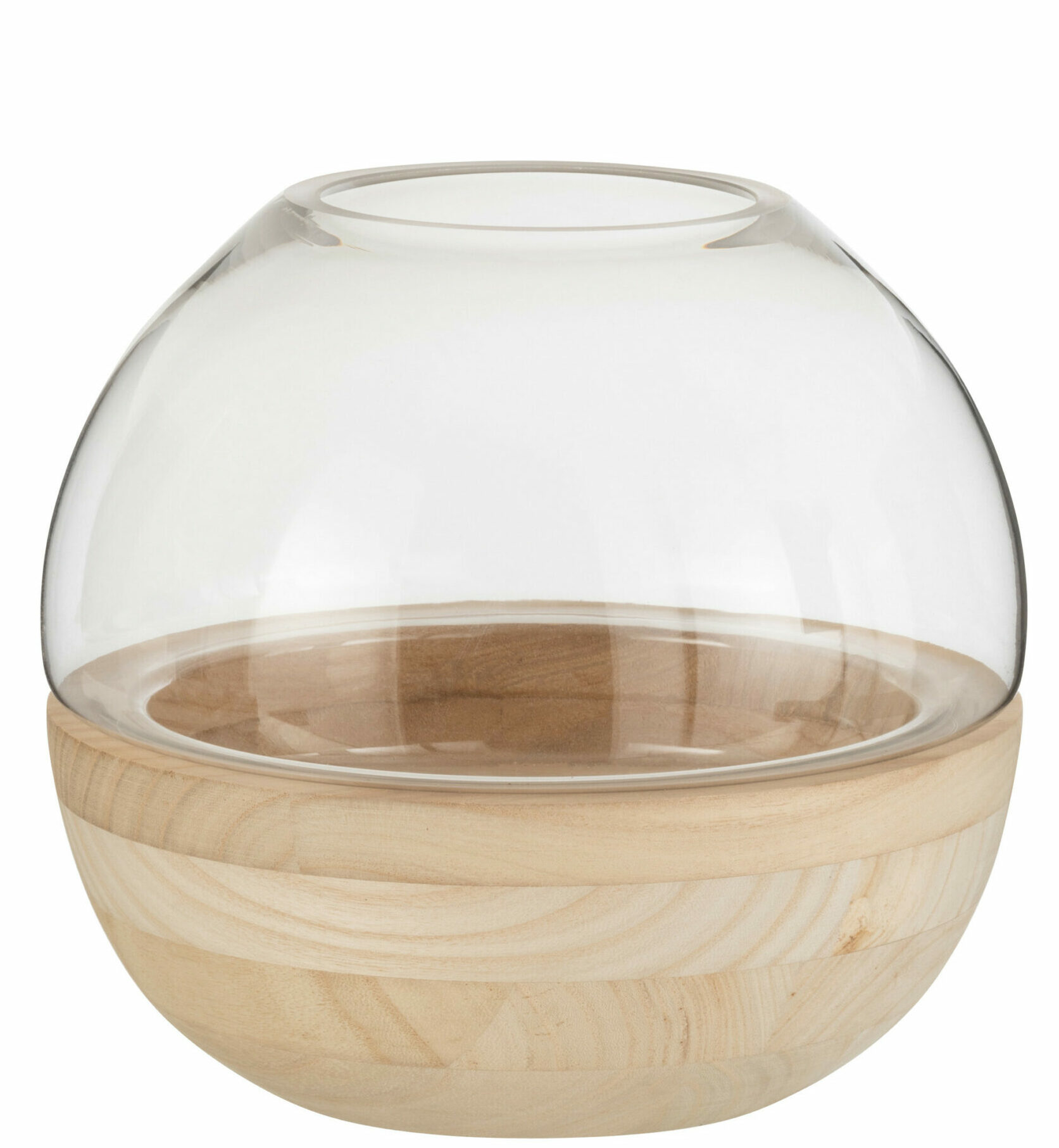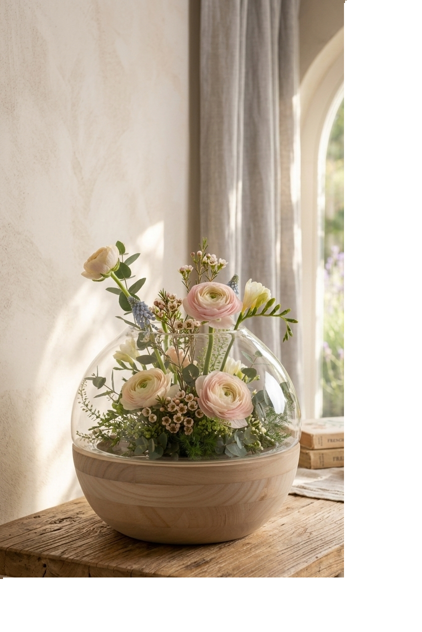 Ce vase bulle repose délicatement dans une base incurvée en bois clair aux veines naturelles apparentes. L’alliance du verre aérien et du bois massif crée un équilibre visuel apaisant, typique du design scandinave. Parfait pour créer un petit jardin aquatique ou accueillir un bouquet rond.